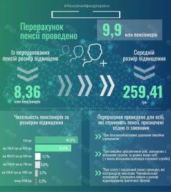 Перерахунок проведено автоматично (без особистих звернень) 9,9 мільйона пенсіонерів. Розмір пенсій підвищено 8,36 мільйона осіб. Середній розмір підвищення - 259,41 гривні.